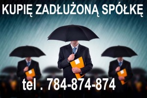 Kupię przejmę zadłużoną spółkę z ograniczoną odpowiedzialnością lub akcyjną w absolutnie każdej sytuacji: finansowej , księgowej , leasingowo, kredytowej , pracowniczej , sądowej , upadłości, likwidacji , dla nas nie ma trudnych sytuacji . Notarialne odkupienie udziałów, akcji zmiana zarządu , siedziby oraz nazwy . Wszystko to z dnia na dzień w 24 godziny tel.784-874-874 lub www.spolki.biz